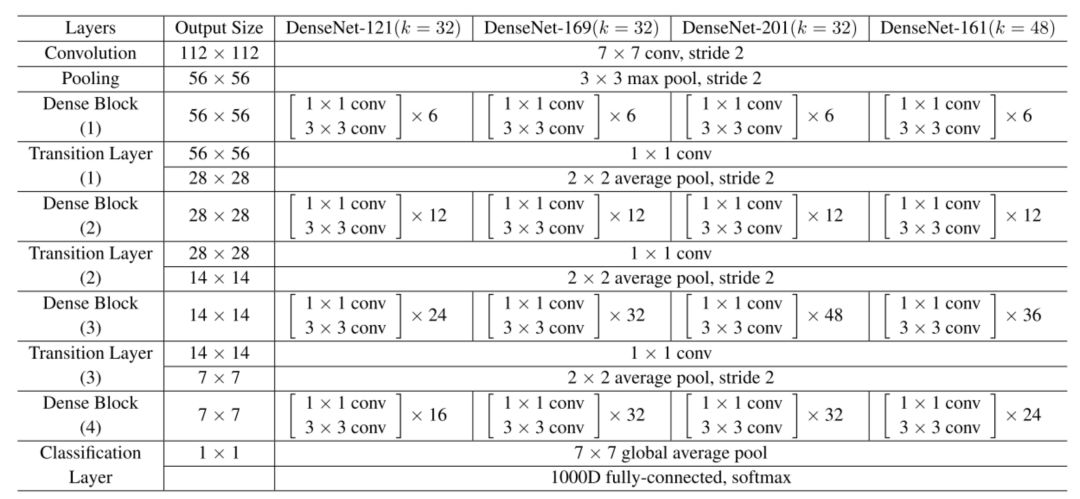 遵循该范式,我们知道第 l 层将具有 k *(l-1)+ k_0 个输入特征映射,其中 k_0 是输入图像的通道数目。作者使用一个叫作「增长率」的超参数 (k) 防止网络过宽,他们还用了一个 1*1 的卷积瓶颈层,在昂贵的 3*3 卷积前减少特征映射的数量。整体架构如下表所示: