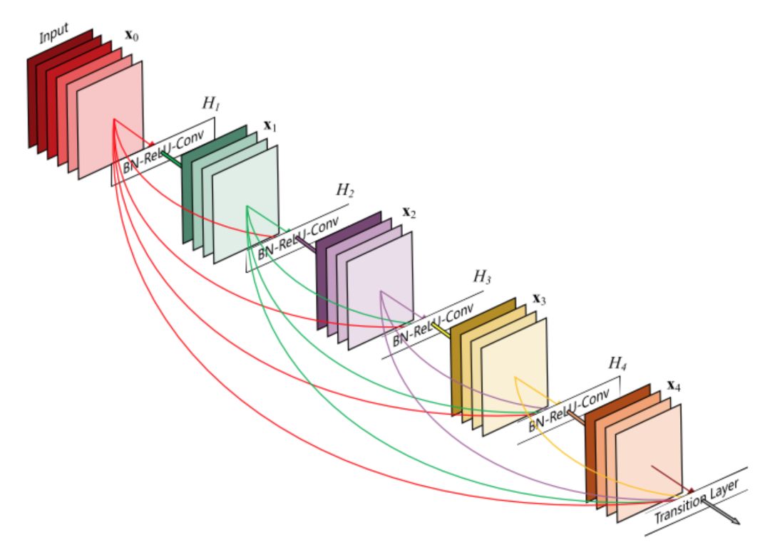 Huang 等人在论文 [9] 中提出一种新架构 DenseNet,进一步利用快捷连接,将所有层直接连接在一起。在这种新型架构中,每层的输入由所有之前层的特征映射组成,其输出将传输给每个后续层。这些特征映射通过深度级联聚合。