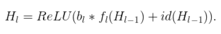 既然我们已经知道了 H_(l-1) 是 ReLU 的输出,而且这个输出结果已经是非负的,所以上述方程可简化为将输入传递到下一层的 identity 层: