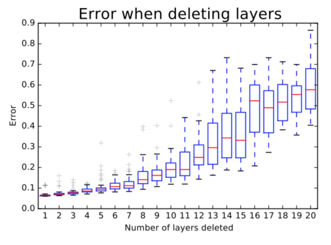[10] 提出一种反直觉的方法,即在训练中随机丢弃网络层,并在测试中使用完整的网络。[14] 介绍了一种更加反直觉的方法:我们实际上可以删除已训练 ResNet 的部分层,但仍然保持相对不错的性能。[14] 还用同样的方式移除 VGG 网络的部分层,其性能显著降低,这使得 ResNet 架构更加有趣。
