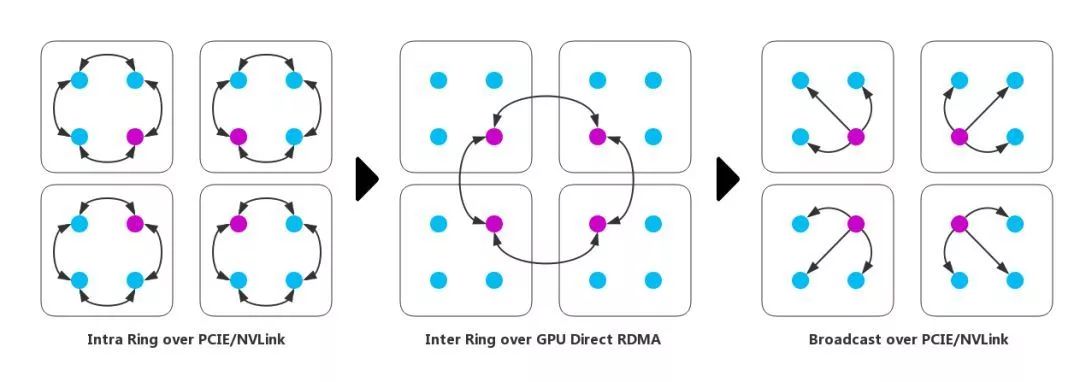 GDR技术加速Ring Allreduce:在前述方案的基础上,将GDR技术应用于跨节点Ring,这减少了主存和显存之间的Copy操作,同时为GPU执行规约计算提供了便利。