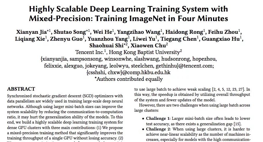 编者按:昨天,腾讯和香港浸会大学的研究人员在arxiv上发表了一篇文章,介绍了一种具有混合精度的高度可扩展的深度学习训练系统。或许是觉得这个名字不够吸引人,他们又在后面加了一个颇具标题党意味的后缀——“4分钟训练ImageNet”。那么这样的措辞是否夸大其词了呢?让我们来读读他们的论文。