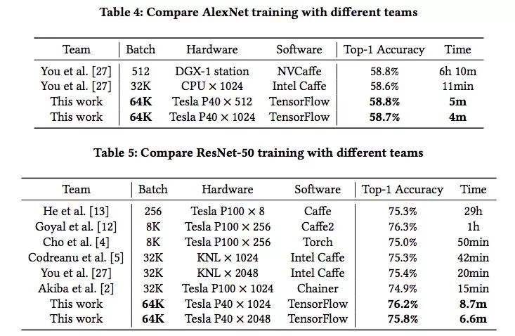 这三大成果的直接效果是在不降低分类准确率的同时,把AlexNet和ResNet-50训练时所用的mini-batch size扩大至64K。同时,通过优化All-reduce算法,并让系统支持半精度训练,研究人员最后构建了一个高吞吐量分布式深度学习训练系统,可以在GPU数量N不变的情况下,提高单个GPU性能S和缩放效率e。
