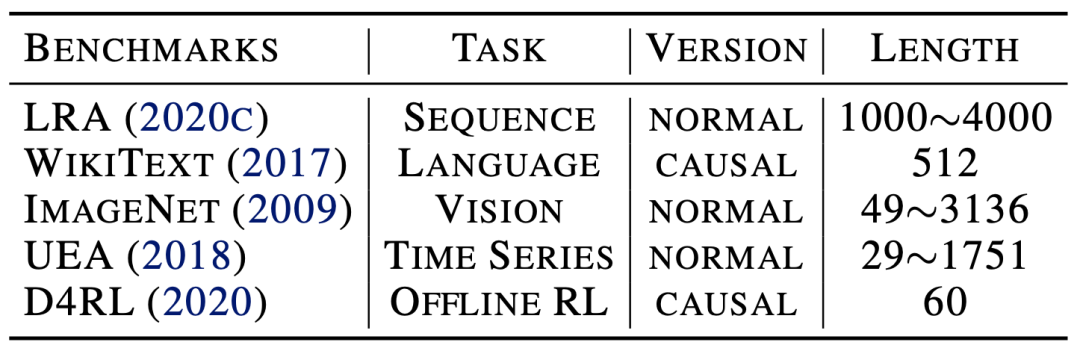 覆盖了长序列、视觉、自然语言、时间序列、强化学习五大任务;