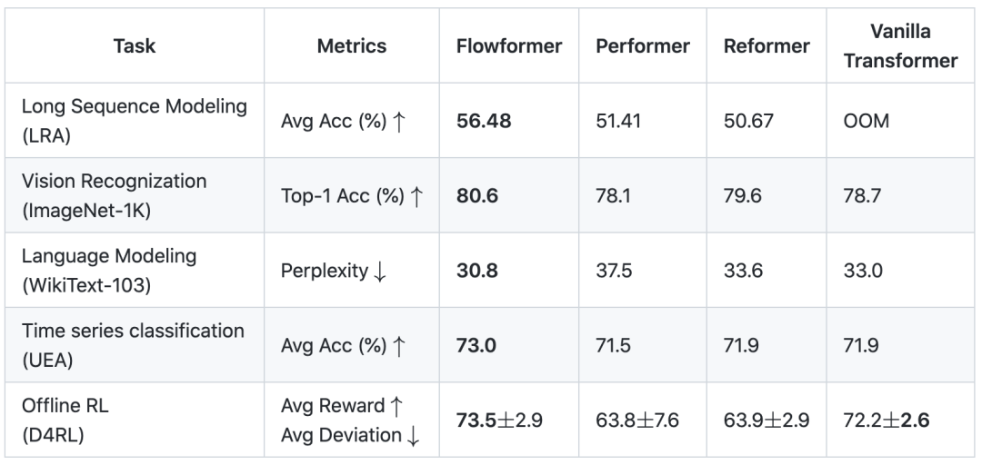 Flowformer在长序列、视觉、自然语言、时间序列、强化学习五大任务上取得优秀效果。此外,Flowformer中「无特殊归纳偏好」的设计理念也对通用基础架构的研究具有一定的启发性。