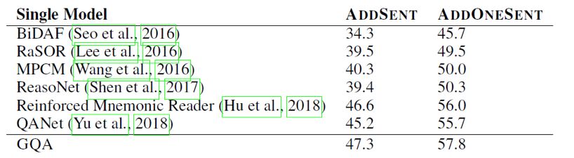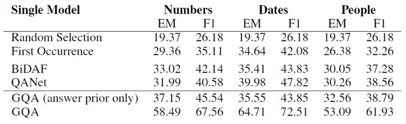 可以看到生成模型的效果要比效果最好的判别模型略差,但是本文的论点在于生成模型对question和context有更全面的理解,从而让模型有更好的泛化能力和应对对抗样本的能力。为了验证模型的泛化能力,本文作者构建了一个SQuAD的子集,该子集中训练样本中的context都只包含一个日期,数字或者人名类实体,但是在测试样本中有多个。如果模型在训练时仅依赖context中特殊类型的实体作为答案的数据特征,那么在测试集上就会表现很差。