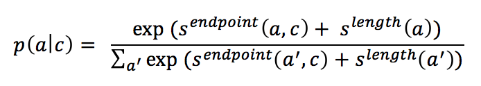 (1) 如果context是文档,例如SQuAD数据集,那么用ELMo得到context的表示后,该表示经过全连接层映射得到一个score(记为),该score在和候选answer的长度指标(),这两个score按如下公式得到每个候选answer的概率