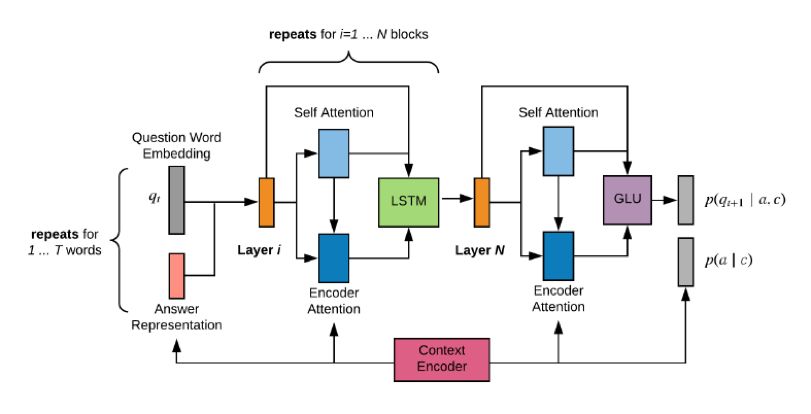 其次是p(q|a,c)部分,本文将其看做是文本生成问题,即采用Encoder-Decoder架构,根据answer, context的encoding结果,采用decoder生成question。模型采用的Decoder的架构为: