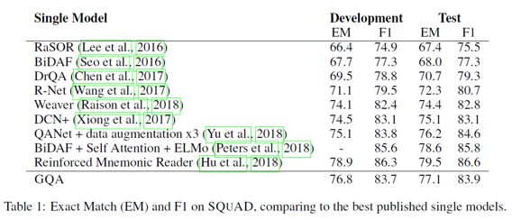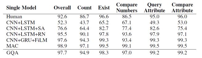 模型的实验结果如下所示,在SQuAD和CLEVR上都取得了仅次于当前state-of-the-art的判别式机器阅读模型的效果:
