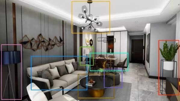 以图搜商品将解决文字搜索无法精确描述场景的问题,如海淘搜索商品时语种不对称、实时场景中看到心仪商品但信息不对称的情况等。不过,想要对效果图进行解锁提取家具的单品图,我们需要采用目标检测(Object Detection),目的是将效果图中的每个家具独立框选出来,并且识别出框中的是沙发、茶几、电视柜、床等家具类别。