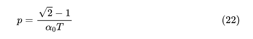 这个显式解不但能让编程实现更方便,还使得 p 的含义更为清晰。比如我们希望学习率在 T 步后就降低为原来的一半,那么就有