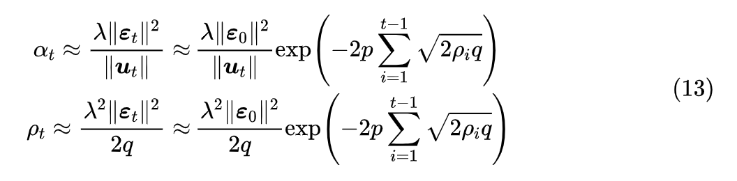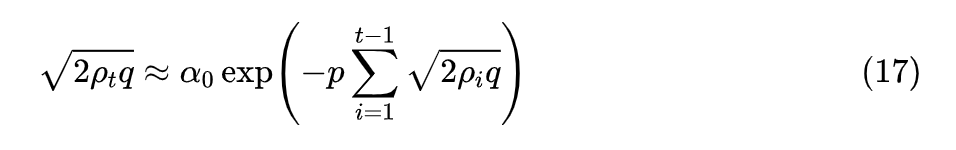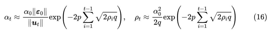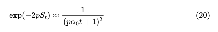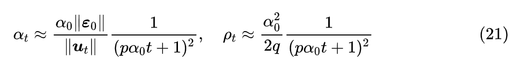 这就是衰减函数的显式解,表明超参数应该按照步数的平方反比衰减,具体代入式 (16) 后得到