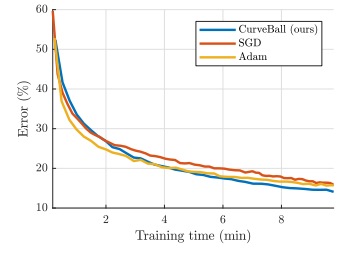 在本文中,我们提出了一种新的算法,它可以克服这些困难并使得二阶优化适用于深度学习。我们特别展示了如何去避免存储黑塞矩阵或其逆矩阵的任何估计值。反之,我们将牛顿更新,即 H−1J 的计算看成是求解一个能通过梯度下降法求解的线性系统。通过交叉求解步骤和参数更新步骤,求解这个线性系统的成本会随着时间推移被摊销。此外,与共轭梯度法不同,梯度下降的选择使其对噪声稳健。我们提出的方法增加了很小的开销,因为一个黑塞矩阵向量积可通过两步自动微分的现代网络实现。有趣的是,我们证明了我们的方法等价于带有一个额外项的动量 SGD(也称为重球法),这个额外项能计算曲率。因此,我们将该方法命名为 CURVEBALL。与其他方法不同,我们方法的总内存占用与动量 SGD 一样小。
