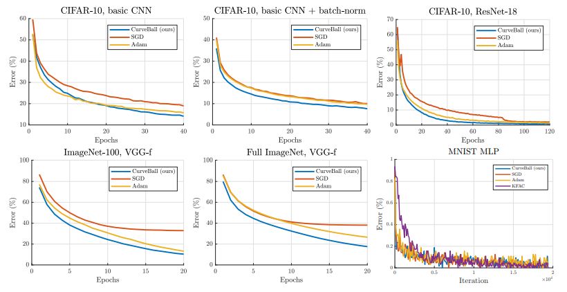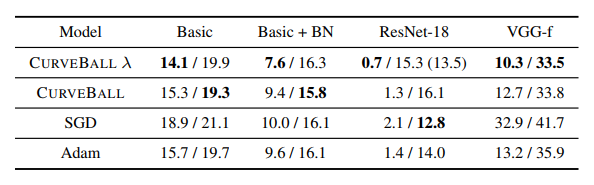 表 2:不同模型和优化方法的最佳百分比误差(训练/验证误差)。CURVEBALL λ 表示使用了重新调整的参数 λ(第 3 节)。括号内的数字表示带有额外 Dropout 正则化(比例 0.3)的验证误差。前 3 列在是在 CIFAR - 10 上训练的,第 4 列是在 ImageNet - 100 上训练的。