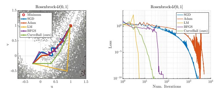 图 1:已知解决方案的问题。左:不同求解器的 Stochastic Rosenbrock 函数轨迹(较深的阴影区域表示较高的函数值)。右:针对轨迹图绘制的损失函数与迭代数之间的关系。