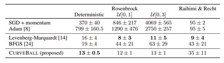 表 1:在小数据集上优化器的比较。对于每一个优化器,我们展示了解决问题所需迭代数的平均值 ± 标准差。对于随机 Rosenbrock 函数,U[λ1, λ2] 表示来自 U[λ1, λ2] 的噪声(详见 4.1)。