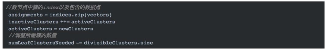 获取第一个簇之后,我们需要做的就是迭代分裂可分裂的簇,直到满足我们的要求。迭代停止的条件是activeClusters为空,或者numLeafClustersNeeded为0(即没有分裂的叶子簇),或者迭代深度大于LEVEL_LIMIT。