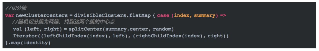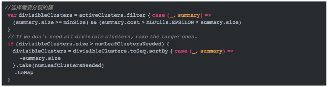 这里选择分裂的簇用到了两个条件,即数据点的数量大于规定的最小数量以及代价小于等于MLUtils.EPSILON * summary.size。并且如果可分解的簇的个数多余我们规定的个数numLeafClustersNeeded即(k-1), 那么我们取包含数量最多的numLeafClustersNeeded个簇用于分裂。
