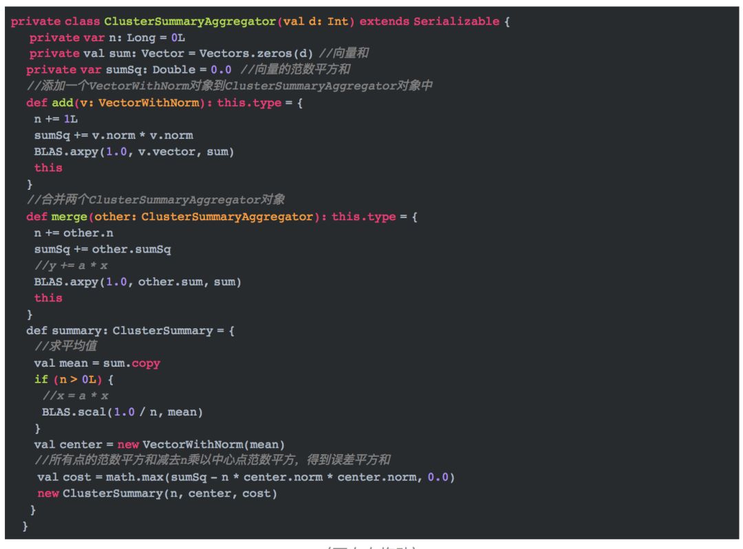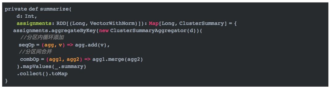 这里的d表示特征维度,代码对assignments使用aggregateByKey操作,根据key值在分区内循环添加(add)数据,在分区间合并(merge)数据集,转换成最终ClusterSummaryAggregator对象,然后针对每个key,调用summary方法,计算。 ClusterSummaryAggregator包含三个很简单的方法,分别是add,merge以及summary。