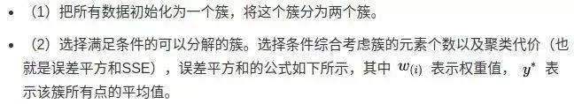 以上过程隐含着一个原则是:因为聚类的误差平方和能够衡量聚类性能,该值越小表示数据点越接近于它们的质心,聚类效果就越好。 所以我们就需要对误差平方和最大的簇进行再一次的划分,因为误差平方和越大,表示该簇聚类越不好,越有可能是多个簇被当成一个簇了,所以我们首先需要对这个簇进行划分。