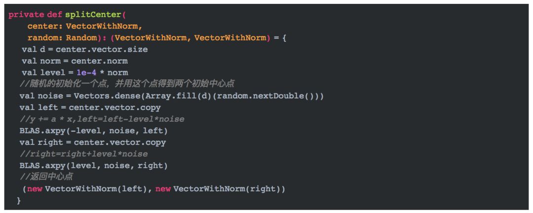 在上面的代码中,用splitCenter方法将簇随机地分为了两簇,并返回相应的中心点,它的实现如下所示。