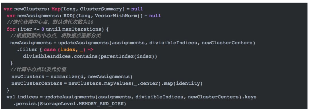这段代码中,updateAssignments会根据更新的中心点将数据分配给距离其最短的中心点所在的簇,即重新分配簇。代码如下: