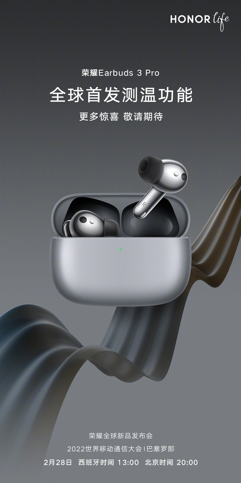 目前关于这款耳机的相关爆料还不多,官方称该耳机拥有旗舰音质,支持全面降噪,还有更多首发技术。值得一提的是,2020 年荣耀曾推出过一款带测温功能的荣耀 Play 4 Pro 手机,对大家来说也是比较新奇。测温功能对于仍处在新冠疫情环境中的人们还是比较有用的,而且耳机作为贴身电子产品,相比手机测温会更加方便。