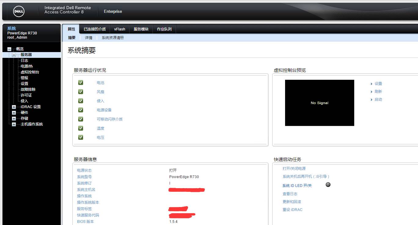 使用上期配置过的IP来登录iDRAC,默认情况下账号为root,密码为calvin,然后来到主界面。