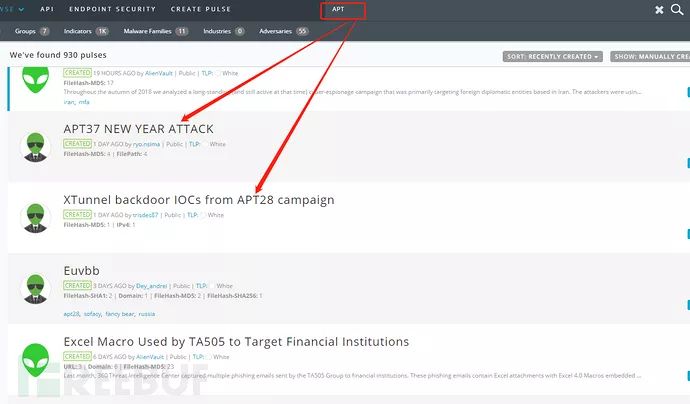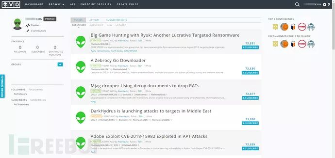 AlienVault还提供了一个由OTX免费的全球威胁仪表盘,可以在https://www.alienvault.com/open-threat-exchange/dashboard#/threat /top获得,该仪表盘展示了来自OTX社区的一些威胁数据。接下来介绍个人对OTX的使用:
