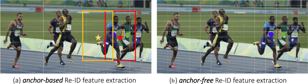 另外一个相关的工作是 JDE [2],它效仿 "one-stage" 物体检测器的思路,去掉了 roi-pool 层,但它依然保留了 anchor 的概念,因此也就依然存在多个(不完美匹配的)anchor 对应一个物体的情况。一个更严重的问题是同一个 anchor(相似的图像区域)可能会对应不同的人,假如一张图像中有两个相邻的人,并且存在一个 anchor 和这两个物体的交集都很大,在前后两个不同的时刻,因为人或相机微小的运动,可能导致该 anchor 需要输出截然不同的身份标识,从而在很大程度上增加了网络学习的难度。