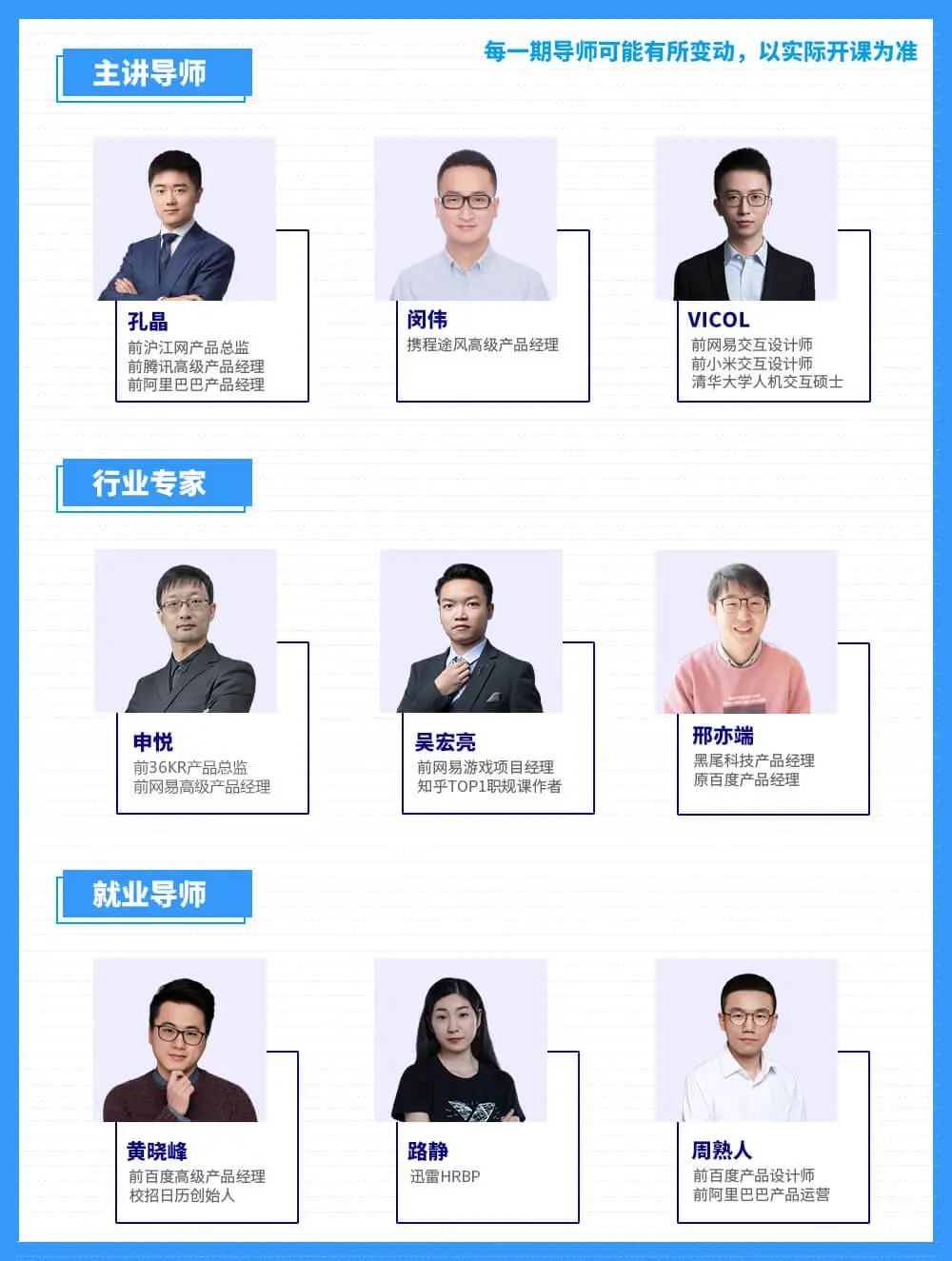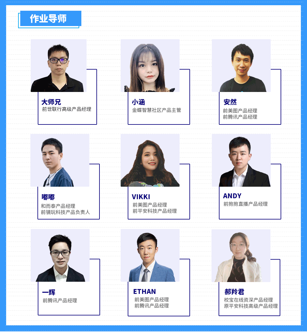 导师团来自一线互联网大厂,他们久经打磨,专业知识过硬,同时洞察行业与市场,能带领你跟上最新趋势,学到的知识不过时。