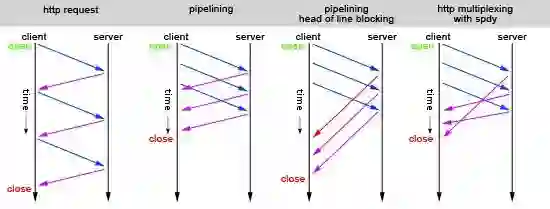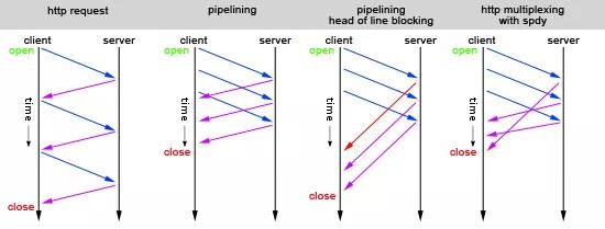 HTTP/1.1通过pipelining管道技术实现一次性发送多个请求,以期提高吞吐和性能,如上图中的序列2。然而,这种技术在接收响应时,要求必须按照发送请求的顺序返回。如果,第一个请求被堵塞了,则后面的请求即使处理完毕了,也需要等待,如上图中的序列3。