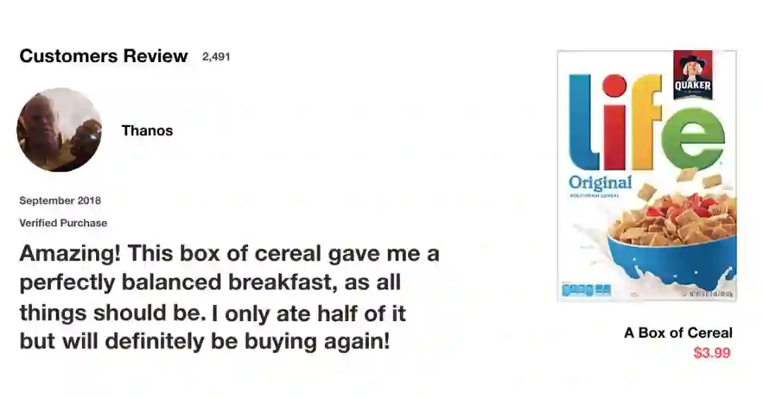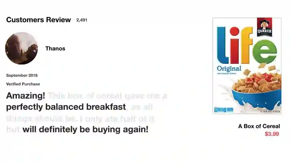 好,让我们从一个思维实验开始。假设你通过在网上看评论来决定是否买 Life 牌麦片。因为我们先看评论,然后判断其他人认为它是好还是坏。