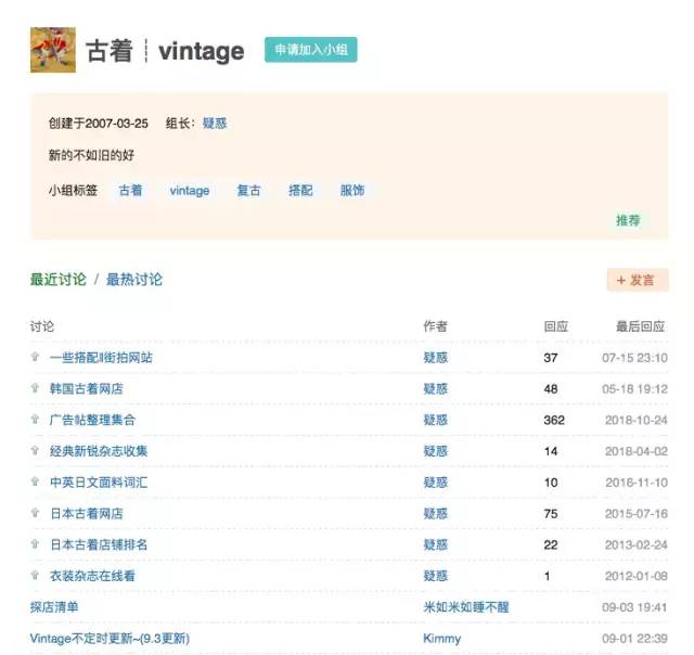 △豆瓣古着小组,一个成立于2007年、直到今天还保持一定活跃度的细分小组。这里既有纯粹的分享帖,也有交易帖。