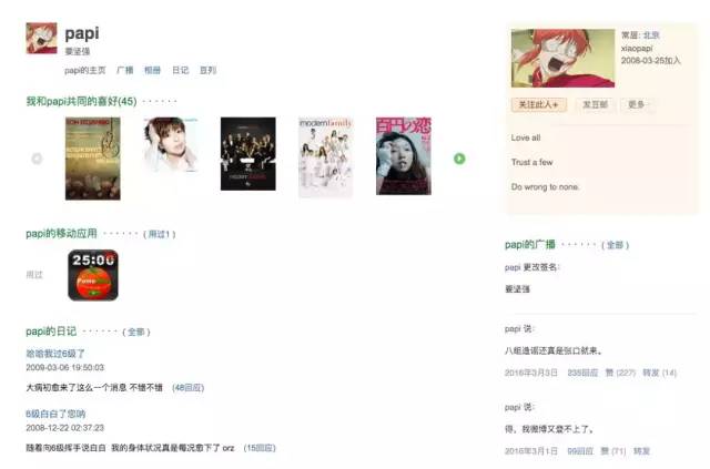说回豆瓣初创那几年。从2005年开始,文青们就把自己看过的书影音标记在豆瓣上,还凭这个结交到朋友。一来二去,豆瓣站内形成了别处没有的、以兴趣爱好为基础的社交网络,用户黏性特别强。