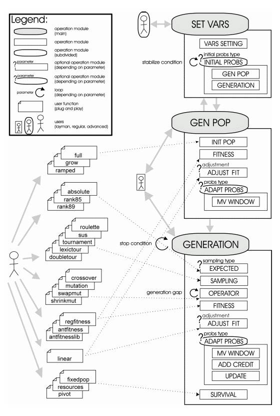 这里 AIM-GP 的 GP 是采用了遗传基因程序中其中一种程序排列方法——"线性排列式遗传基因程序" Linear Genetic Programming (LGP)。线性排列式遗传基因程序 LGP 有别于"树状排列式遗传基因程序" Tree-based Genetic Programming (TGP)。我们可以理解线性排列式遗传基因程序 LGP 是启发自命令式编程 (Imperative Programming);树状排列式遗传基因程序 TGP 启发自函数式编程 (Functional Programming)。命令式编程包含一些会影响状态(state)的指令,例如委派变量的数值。大多数商业用编程程序都是命令式编程,例如 C++,Pascal 和 Fortran。很多研究者甚至索性将树状结构下的分支看待成命令式,而不是函数式,因为很多应用程序,用线性排列式处理显得更为自然。