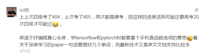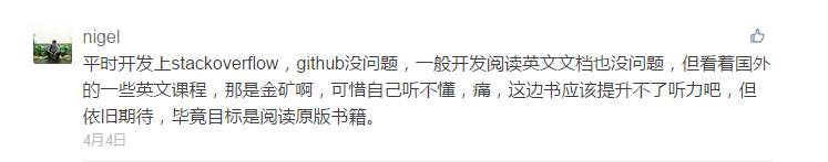 上周微信推送了一篇文章,《程序员,这本书让你快速搞定英语,编程666》(点击文章标题可查看),发布后大家踊跃参与,有关学英语,看看身边小伙伴怎么说?