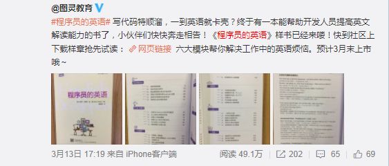 新书预告微博,转发 202,阅读 49.1 万,书还没出印厂小伙伴们就开始满满期待。上市后,大家手速很 6,一天买光了出版社发给京东的库存。其他网店也没闲着,库存告急,印厂已经紧急启动第二次印刷了!可能有的城市现在还没货,别着急,还没拿到书的猿们,可有先看看 GitHub、Stack Overflow上的段子,或者浏览《连线》Medium上的新闻刺激一下学习的决心......在此,小鹿希望每位购买《程序员的英语》的小伙伴,都能坚持学习英语的热情,一如爱代码一样爱英语,先有这份心, 咱们这本书才可能帮助显示器前的你,真正解决烦恼。