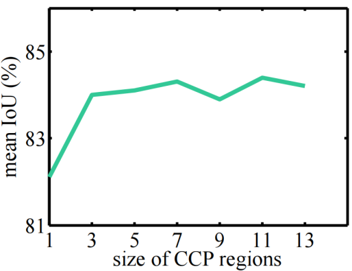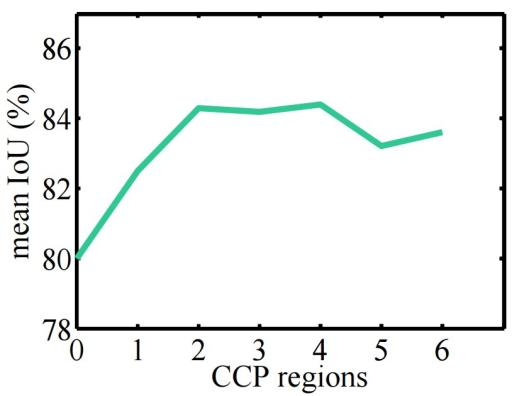 图7为TAGNet在Cityscapes数据集上关于可配置区域大小的实验,可以看到在当前实验中较大的可配置区域会达到更好的效果,但如果可配置区域过大也可能带来较少的性能提升。