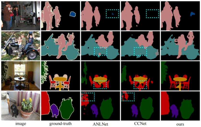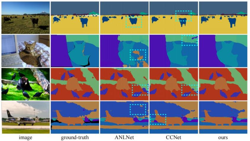 本文在Cityscapes数据集、PASCAL VOC 2012数据集、COCO-Stuff数据集上验证了该方法完成语义分割任务的有效性。其中Cityscapes数据集一共19个语义类别,包含2975张训练图片,500张验证图片,1525张测试图片;PASCAL VOC 2012数据集一共21个语义类别,包含10582张训练图片,1449张验证图片,1456张测试图片;COCO-Stuff数据集一共172个语义类别,分为两个版本:一个版本包含9000张训练图片,1000张验证图片;另一个版本包含120000张训练图片,5000张验证图片。图3、图4和图5分别展示在三个不同的数据集上不同方法的分割效果对比。根据表1中所展示的本方法和已有最优图像语义分割方法在不同数据集上的实验结果表明:无论在室内或室外场景,大规模或小规模数据集,本方法的语义分割效果都要比现有的最优方法要好。