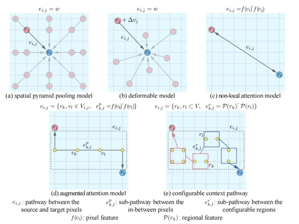 语义分割是推断RGB图像中每个像素的对象标签的一个计算机视觉领域的基本任务。语义分割的挑战主要在于外观的变化和像素级别的物体类别的不确定性,因此在像素间交换上下文信息对于使用卷积神经网络解决此类问题就是很重要的。现有的构造上下文路径的方式主要有构造加权路径[1,2,3]和构造增强路径[4]两种,如图1所示。本文提出基于可配置上下文路径的语义分割方法在不同尺度上选取更有效的信息。