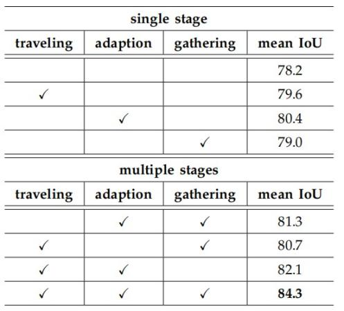 表2为TAGNet在Cityscapes数据集上traveling、adaption、gathering三个模块的消融实验,可以看到三个模块均能给baseline模型带来分割效果的提升。