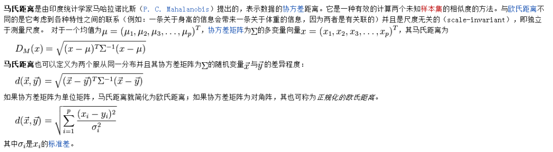 注:马氏距离一定要先给出样本集的统计性质,比如均值向量,协方差矩阵等。关于马氏距离的介绍如下: