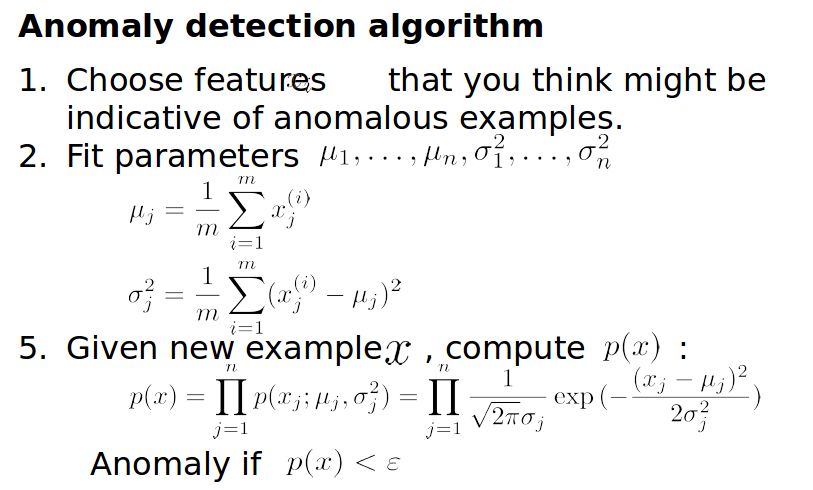 如果样本有n维,则每一维的特征都可以看作是符合高斯分布的,即使这些特征可视化出来不太符合高斯分布,也可以对该特征进行数学转换让其看起来像高斯分布,比如说x=log(x+c), x=x^(1/c)等。异常检测的算法流程如下: