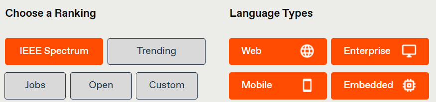 另外需要指出的是,IEEE 将编程语言以四个标签划分,分别是:用于开发网站和应用的语言(Web)、用于企业、桌面和科学应用的语言(Enterprise)、用于移动设备端的语言(Mobile)以及用于嵌入式环境的语言(Embedded)。