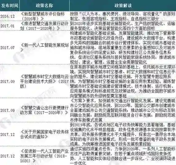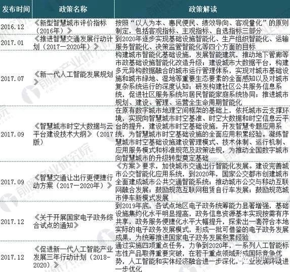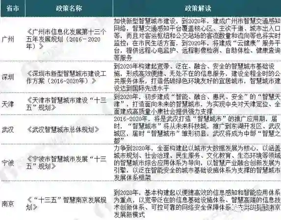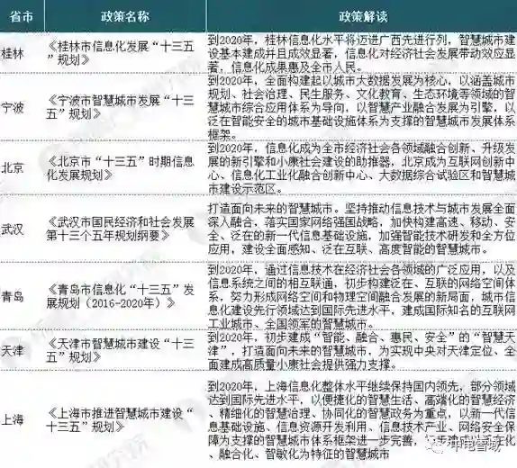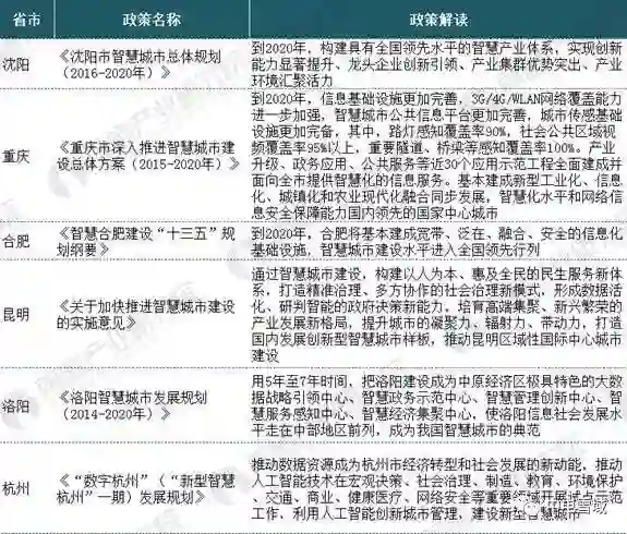 国务院颁布的《国家新型城镇化规划(2014-2020年)》第十八章第二节将智慧城市建设作为重点。智慧技术在城市中的关键应用领域包括:(1)宽带信息网络;(2)城市规划管理信息化,包括政务信息共享;(3)交通、电力、给排水、管网等基础设施智能化;(4)公共服务便捷化;(5)产业发展现代化;(6)社会治理精细化。