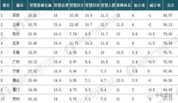 图表6:2017中国智慧城市发展水平评估表前十名排名