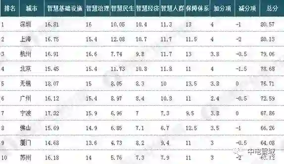 此次评估得分前十名的城市分别是深圳、上海、杭州、北京、无锡、广州、宁波、佛山、厦门、苏州。其中深圳和上海得分超过80分,领跑其他城市,杭州、北京、无锡、广州四个城市成绩均在70分以上,智慧城市建设成果突出,而宁波、佛山、厦门、苏州四个城市成绩则在60-70分之间,智慧城市建设成果相对较好。总的来看,前十名城市在总分成绩上存在一定差距,但每个领域得分较为均衡,说明以上城市的智慧城市建设注重均衡发展,这为我国其他城市建设提供了良好的标杆示范。