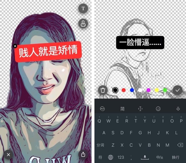 使用 Sticky 做表情包非常快捷,你只需要打开相机,对着镜头做表情即可。短按快门按钮制作静态表情,长按则可录制动态表情。Sticky 会自动识别人物轮廓,将形象勾勒出来。之后你可以为表情添加滤镜和背景,并加上各种字幕,进一步明确意义。编辑完成后,点击右下角的分享,你可以快速将表情分享到 iMessage、Telegram 或是将它保存下来。你也可以通过 Pin 或 Workflow 等第三方工具,将动态表情分享到微信等第三方聊天应用。
