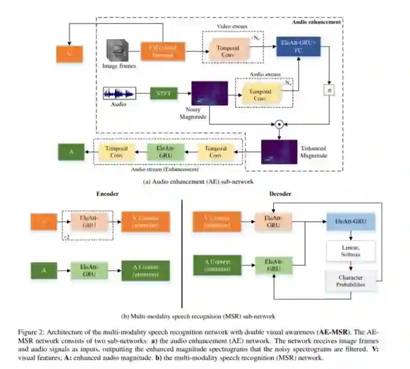 视觉通常被用作音频语音识别(ASR)的补充模态,尤其是在单独音频模态性能显著下降的嘈杂环境中。结合视觉模态,将ASR升级为多模态语音识别(multi-modality speech recognition, MSR)。本文提出了一个两阶段语音识别模型。在第一阶段,通过唇动的视觉信息将目标语音从背景噪声中分离出来,使模型能够清晰地理解。第二阶段,音频模态再次结合视觉模态,通过MSR子网络更好地理解语音,进一步提高识别率。还有一些其他的关键贡献:我们介绍了伪三维剩余卷积(P3D)为基础的视觉前端提取更多的判别性特征; 我们用时域卷积网络(TCN)将时域卷积块从1D ResNet升级到更适合于时域任务的时域卷积网络(TCN); MSR子网络建立在元素智能选通递归单元(eleat - gru)的顶部,在长序列中比Transformer更有效。我们在LRS3-TED和LRW数据集上进行了大量的实验。我们的两阶段模型(音频增强多模态语音识别,AE-MSR)始终以显著的优势实现了最先进的性能,这证明了AE-MSR的必要性和有效性。